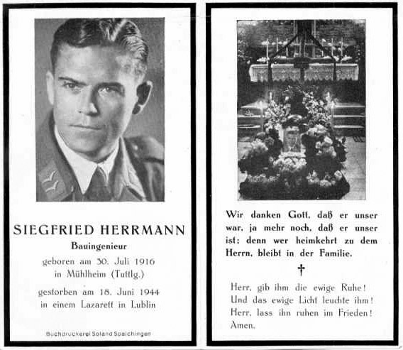 [Above: Siegfried Herrmann (July 30, 1916 - June 18, 1944). This handsome knight was born during one world war and died during another. Two wars that Germany did not start. Two wars waged against her for financial reasons. Our Siegfried Herrmann was 28 years old.