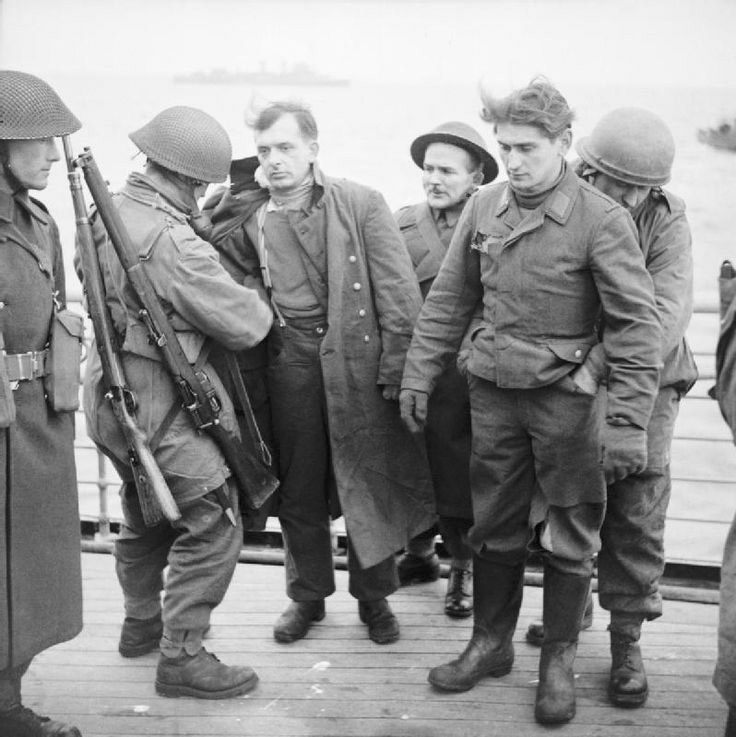 [Above: British paratroopers search forlorn German P.O.W.s. They have been brought aboard a warship from the Normandy landing, June 6, 1944. The paratrooper on the left has a confiscated German rifle and carries a Short Magazine Lee-Enfield Mk I.]