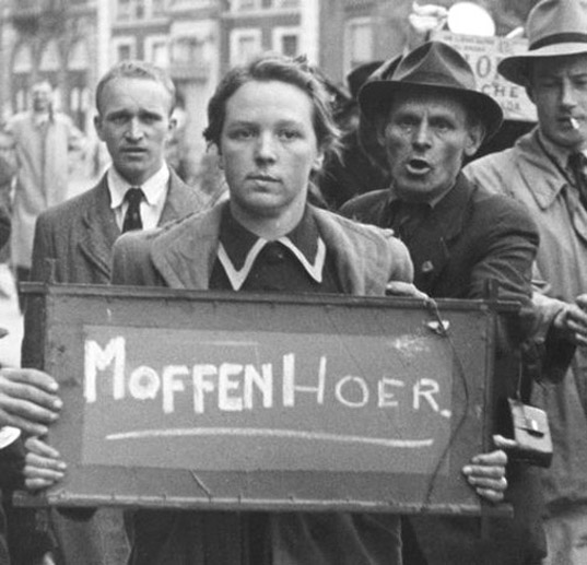 [Above: A Dutch woman after being brutalized and forced to hold a sign with the words 'Moffenhoer' (Kraut whore). She apparently had an alpha-German boyfriend and now the lowly beta-man children are angry.]