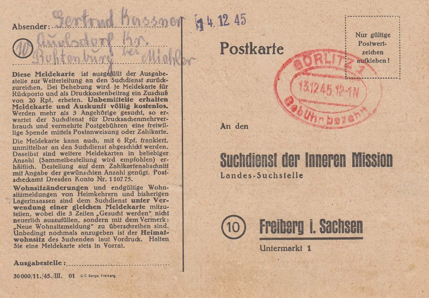 Die Meldekarte kann auch, mit 6 Rpf frankiert, unmittelbar an den Suchdienst abgeschickt werden. Daselbst sind weitere Meldekarten in beliebiger Anzahl (Sammelbestellung wird empfohlen) erhältlich. Bestellung auf dem Zahlkartenabschnitt mit Angabe der gewünschten Anzahl genügt. Postscheckamt Dresden Konto Nr. 110775.