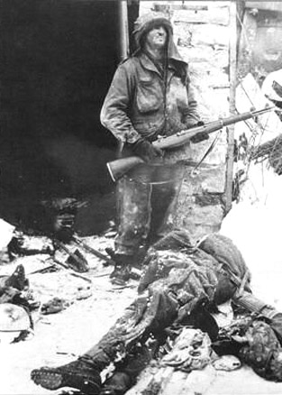 [Above: An American invader stands guard in the midst of murdered German corpses.]
