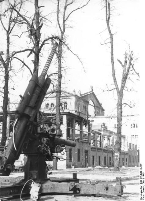 [Above: An abandoned anti-aircraft gun points to the grey sky in Berlin. The many rings around the barrel are kills, 1945. Courtesy of the Bundesarchiv.]