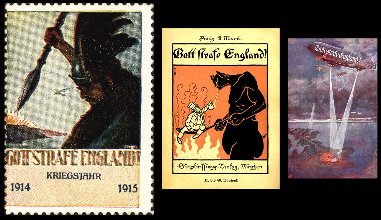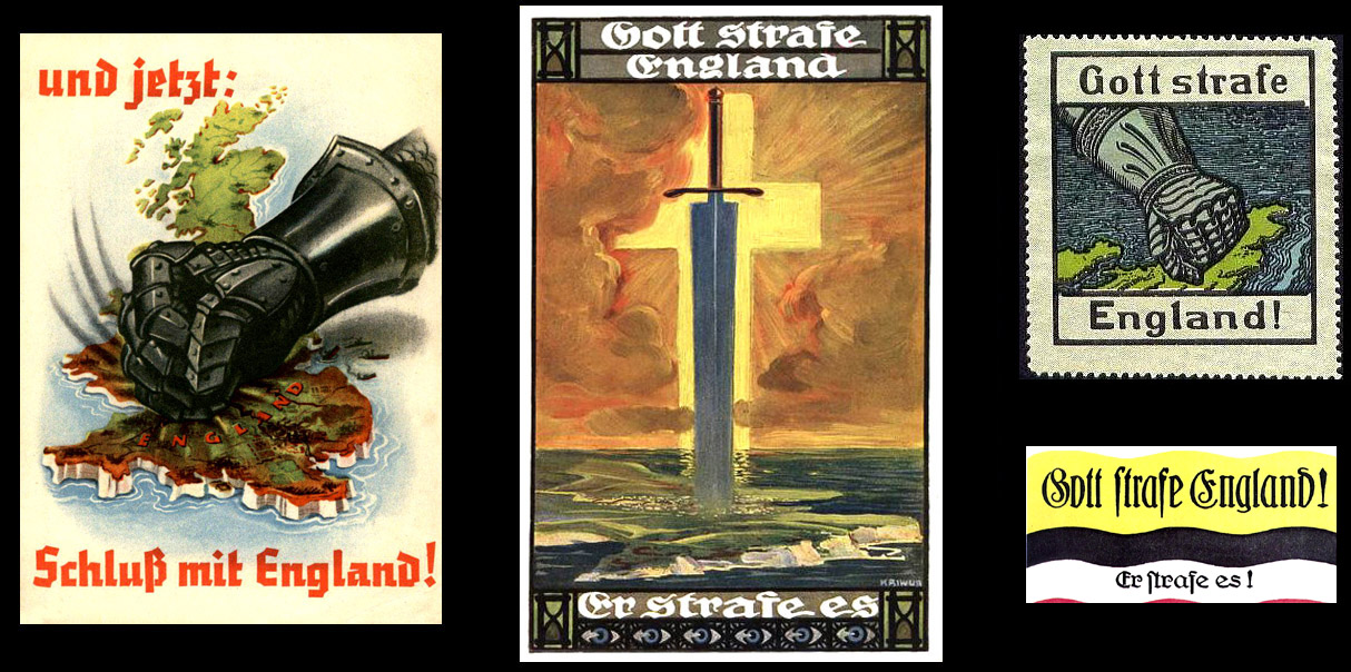 [Above: WWI German unfulfilled promises. Left: 'und jetzt: Schluss mit England!' = 'And Now: Finish Off England!' Center: 'Gott strafe England - Er strafe es' = 'God punish England - May he punish it!' Right top: 'Gott strafe England' = 'God punish England'. Right bottom: 'Gott strafe England - Er strafe es' = 'God punish England - May he punish it!' Looking at the state of England today, I'd say this curse is causing a terrible effect. London is majority non-white. Her empire gone. Her traditions and culture being forgotten. Invaders are welcomed by a corrupt government. But, alas, it would seem this dreadful curse has widened to engulf the whole world. The Curse of England, soon to kill us all.]