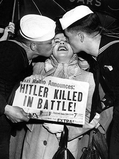 [Above: Sailors Bob Nethery, left, of Powell, Wyoming., and Bob Wickford of Patterson, California., after being tricked into fighting their own brothers and sisters in Europe, celebrate a very dark future for their children. New York, May 1, 1945.]