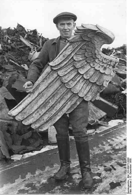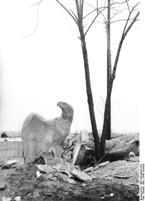 [Above: Summer, 1945. The eagle of the Third Reich, who had soared to utter greatness, such unbelievable highs, now lies in ruin with her people.]