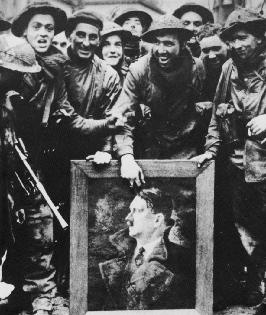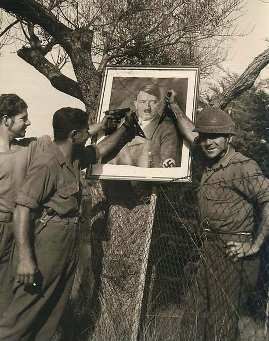 [Above: British soldiers jeer at a painting of Adolf Hitler. He let thousands of British soldiers flee just a few years before at Dunkirk. Now those same soldiers come to spread death and destruction.]