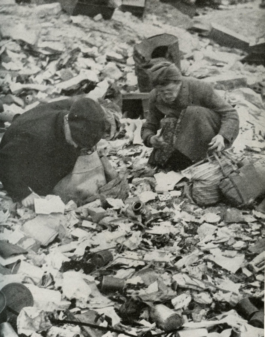[Above: September 1945. 'Germans forage for food. Hungry Germans pick through a garbage dump for scraps of food.
