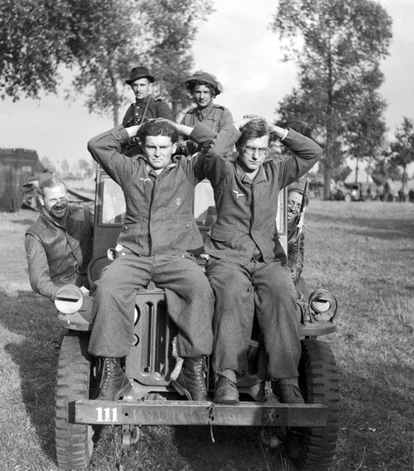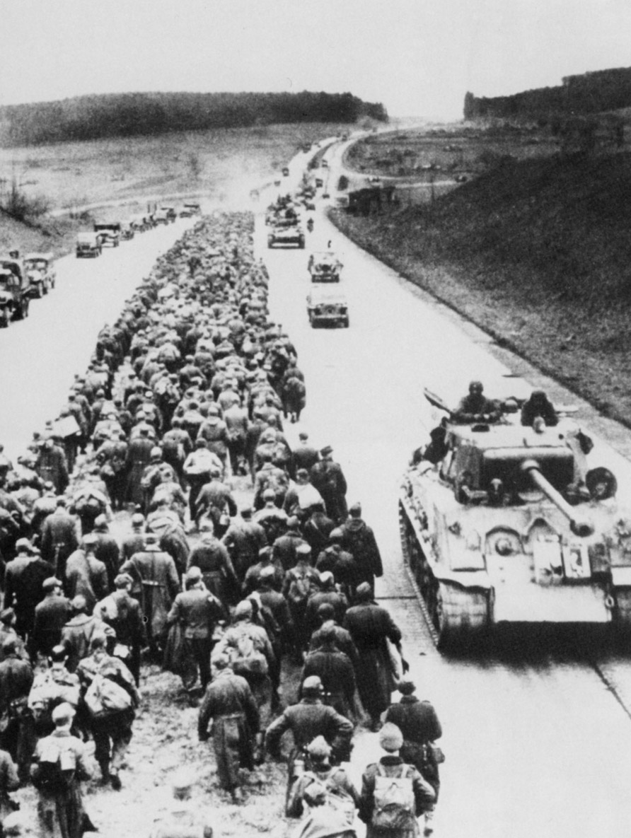 [Above: Captured German soldiers, on their way to concentration camps, where many of them will die. They are herded west, following the Autobahn, yet another National Socialist invention copied all over the world.]