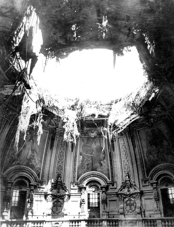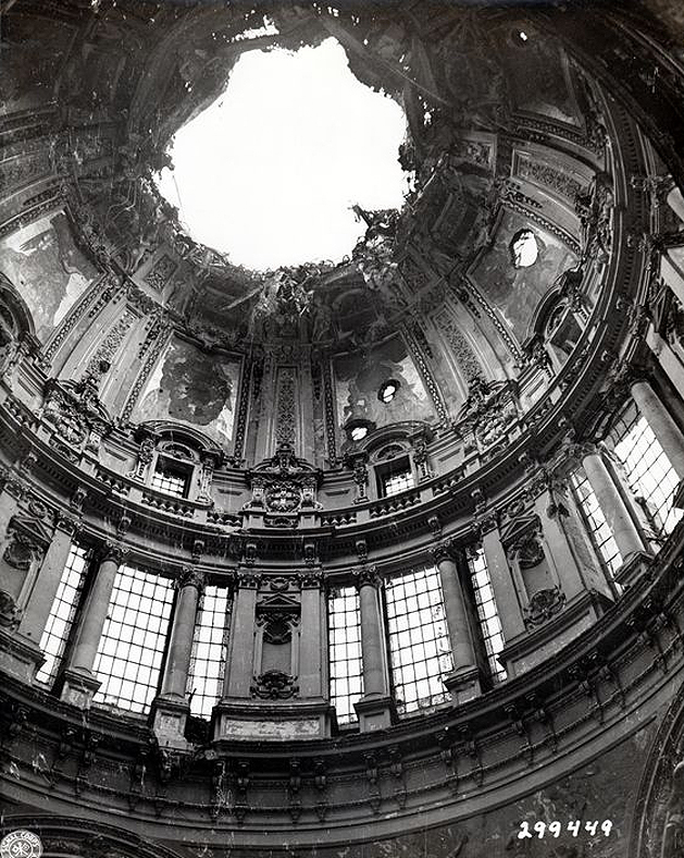 [Above & below: A unexploded bomb tore through the St. Eramus Chapel cathedral, Berlin. It was founded in 1465. The murderous Allied bombs actually targeted things like museums! Yes, it's true. They destroyed countless cultural artifacts of Europe.]