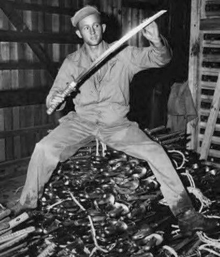 [Above: An American soldier sits atop a mountain of samurai swords. The Americans stopped Japan from destroying communism in China. Now the communist hydra is unleashed.]