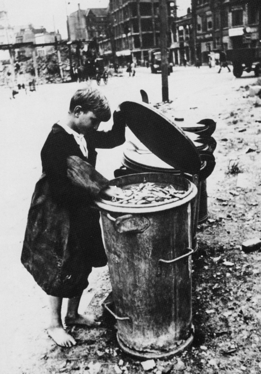 [Above: A barefoot starving German boy, clutching a dirty sheet, searching the garbage for scraps outside a British club in Hamburg, 1946. Patton called the Germans 'The greatest race in Europe'. The Allies threw the Germans to the trash, and stole everything in sight. Millions starved while Allied food supplies were overflowing.]