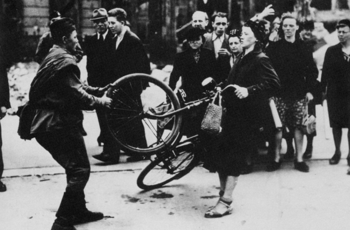 [Above: A communist steals a woman's bike. The Allied troops stole everything in sight, yet they still whine about Germans stealing art. The Allies literally dismantled entire factories, brick by brick, screw by screw and rebuilt the factories in their countries. Many times they would even capture the workers and kidnap them and force them to work. Yet the Allies still dare to say Germany used 'slave labor'. The 'Good Guys' took thousands and thousands of German slaves and enslaved them for many years after the war.]
