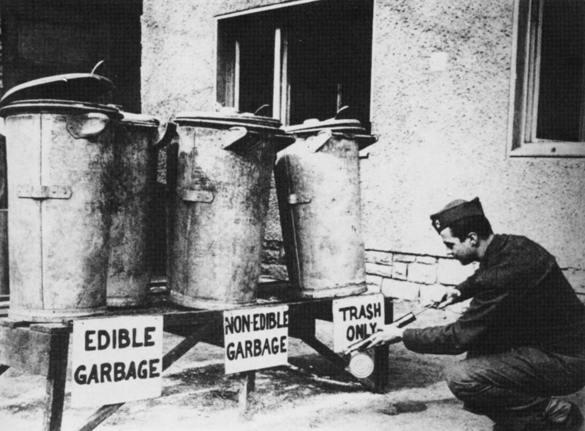 [Above: An American soldier sprays pesticide next to a garbage can labeled so Germans can eat out of their trash.]