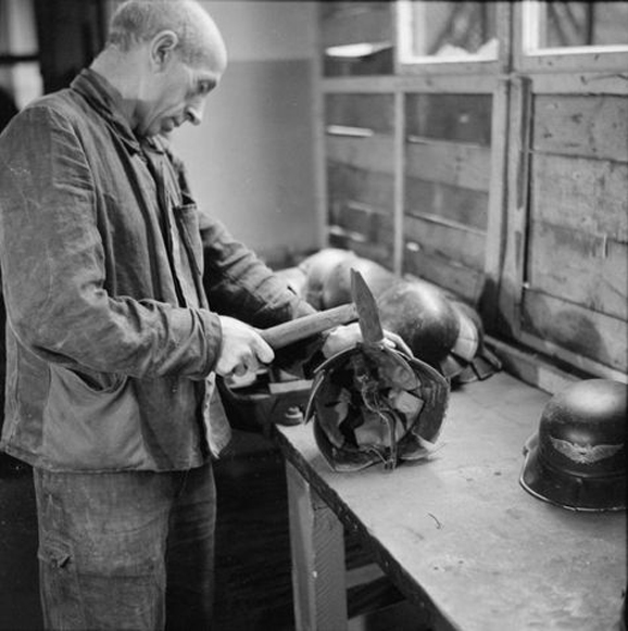 [Above: A German man, old and beaten, wearing clothes of a slave, dismantling helmets to make into cooking pans.]