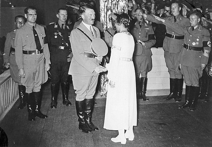 [Below: Adolf Hitler with Gertrud Scholtz-Klink at the 1936 Nuremberg Rally. Photo by Heinrich Hoffmann.]