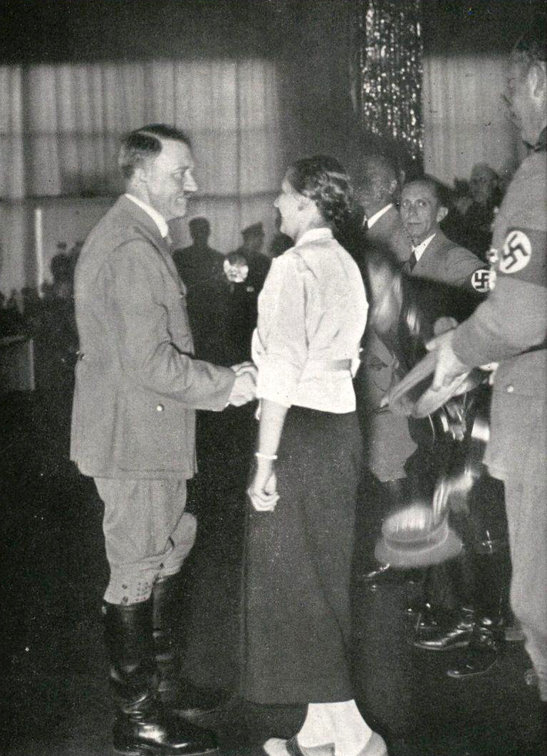 [Below: Adolf Hitler with Gertrud Scholtz-Klink. Rudolf Hess is standing in the background, with Martin Bormann behind him (far left).]