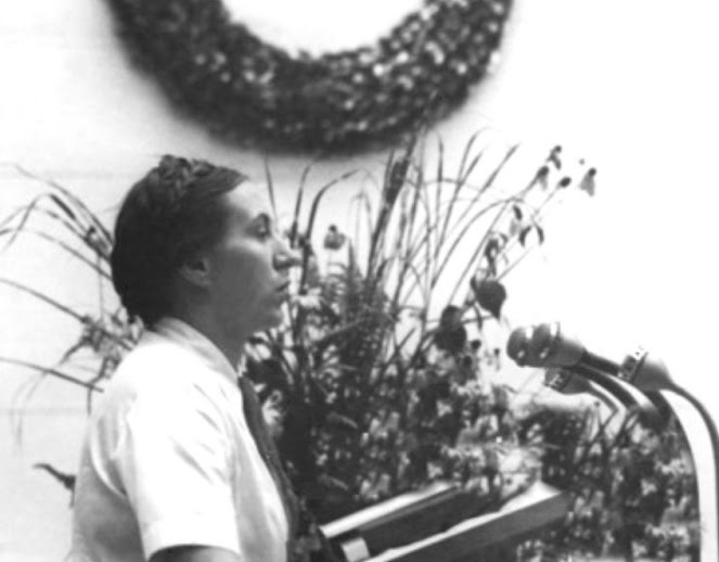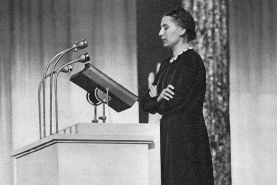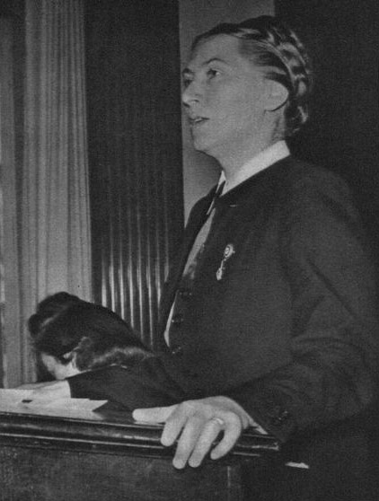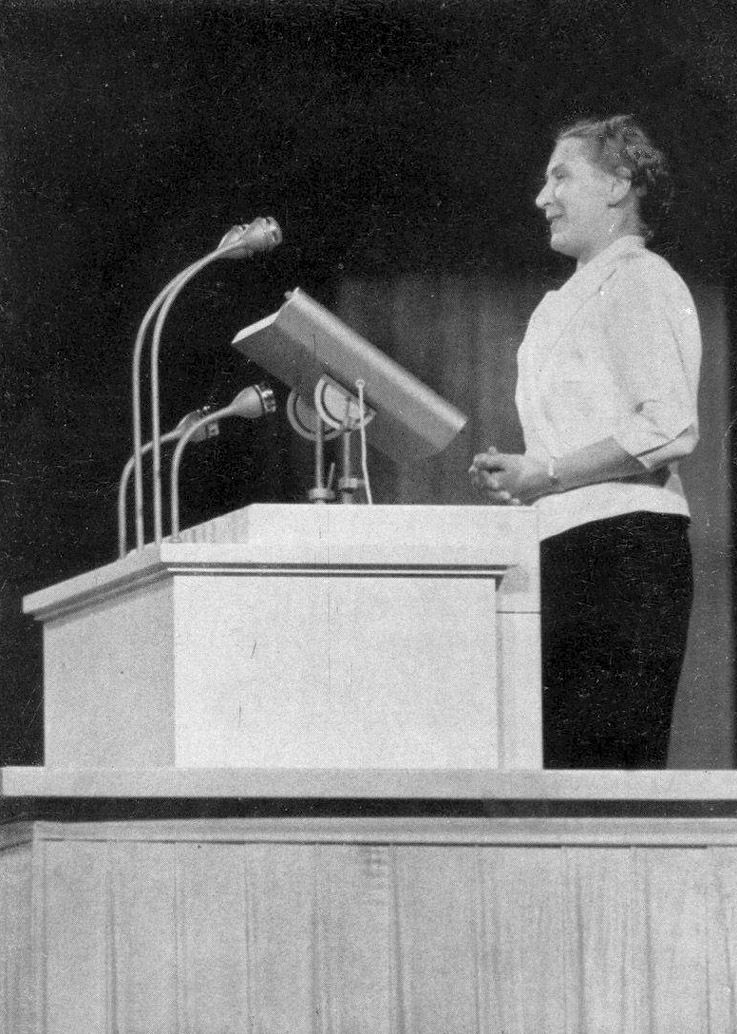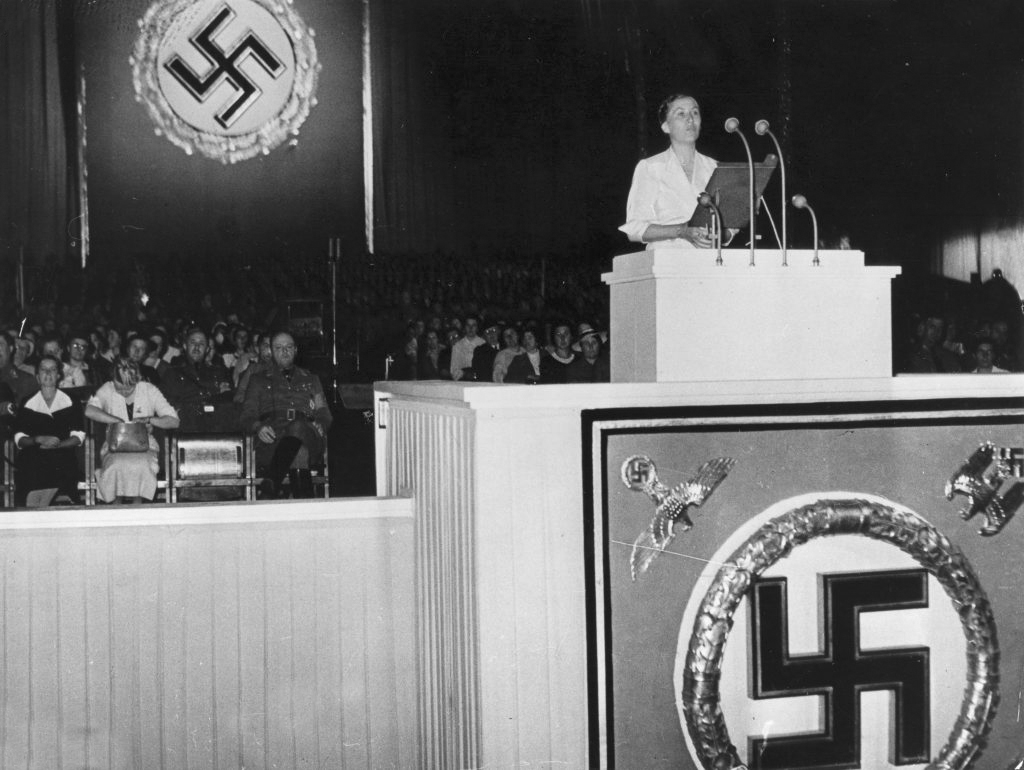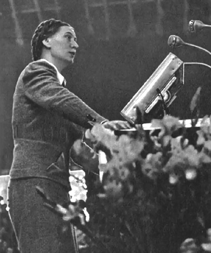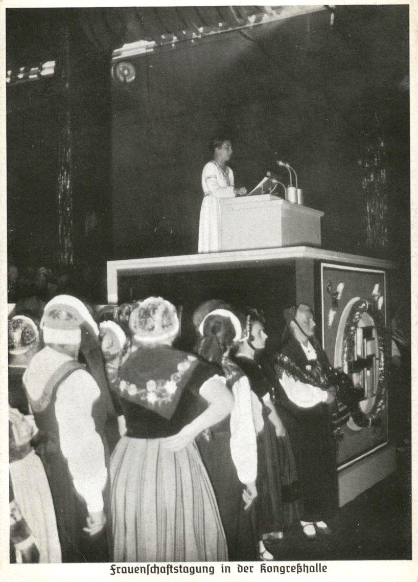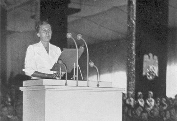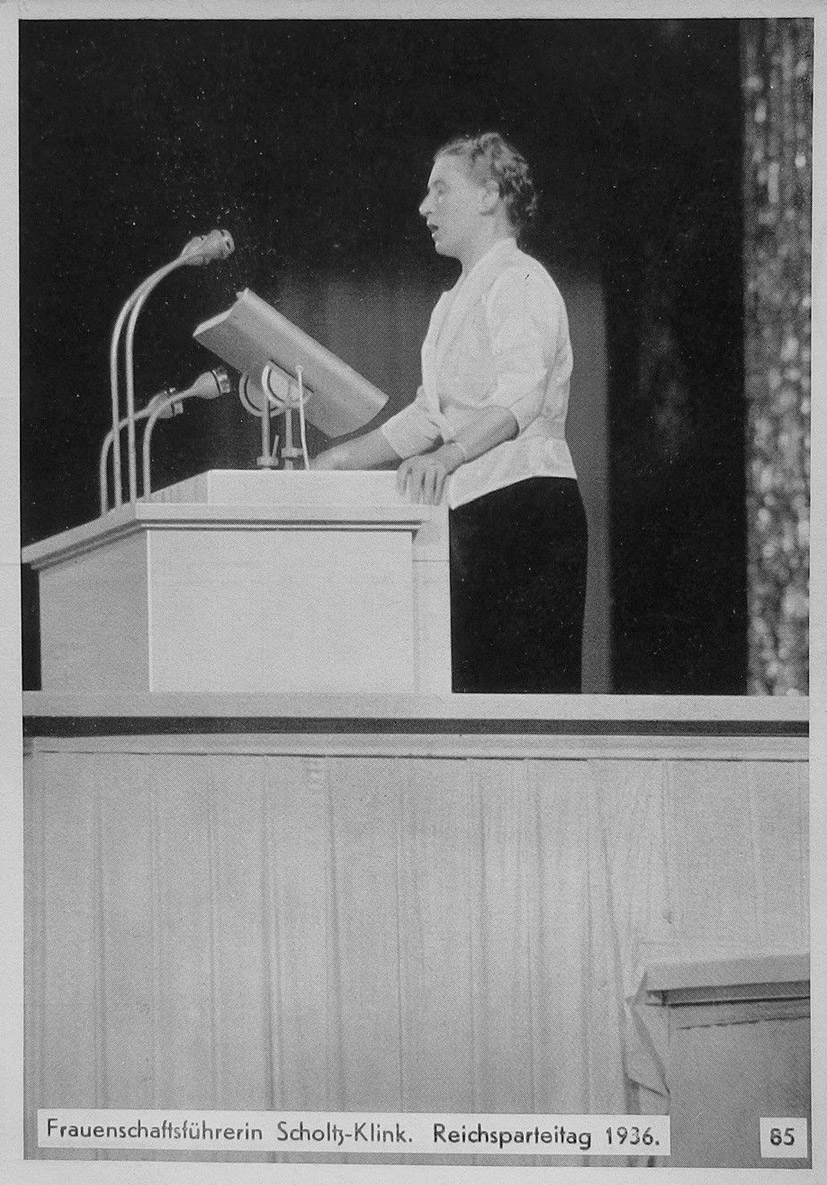 [Below: Gertrud Scholtz-Klink at podium giving a speech at the Reichs Party Day, 1936]