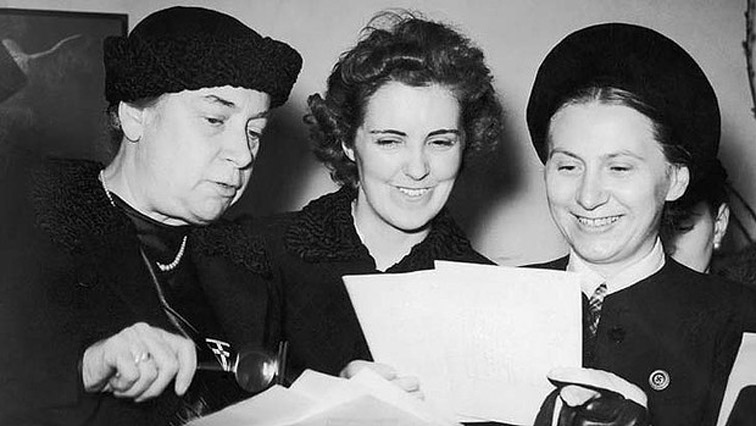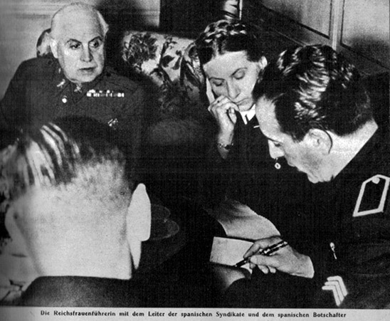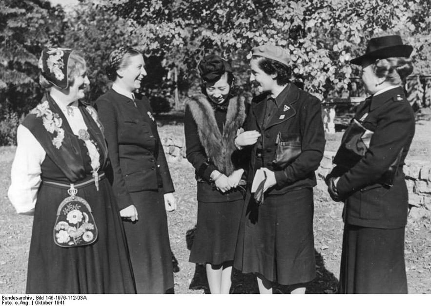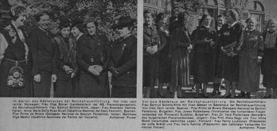 [Below: International women's meeting in Berlin of thirteen nations. From left to right - Norway's Frau Olga Bjoner (Landesleiterin d. Norwegischen NS-Frauenorganisation), Germany's Frau Scholtz-Klink (Reichsfrauenführerin), Japan's Frau Oshima (wife of the Japanese Ambassador Hiroshi Oshima), Spain's Pilar Primo de Rivera (Frauenführerin, founder of the women's Falange section and sister of martyr José Antonio Primo de Rivera) and Italy's Marchesa Olga Medici. October 7, 1941. Courtesy of the Bundesarchiv.]