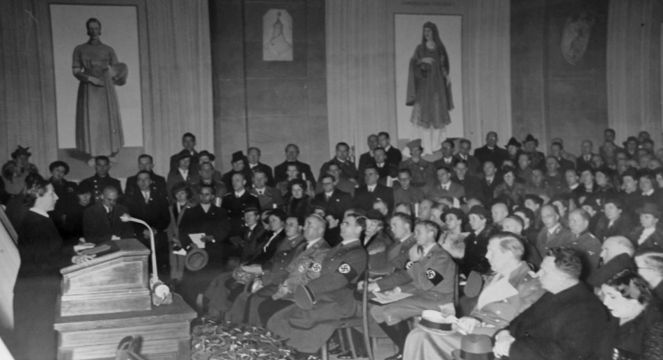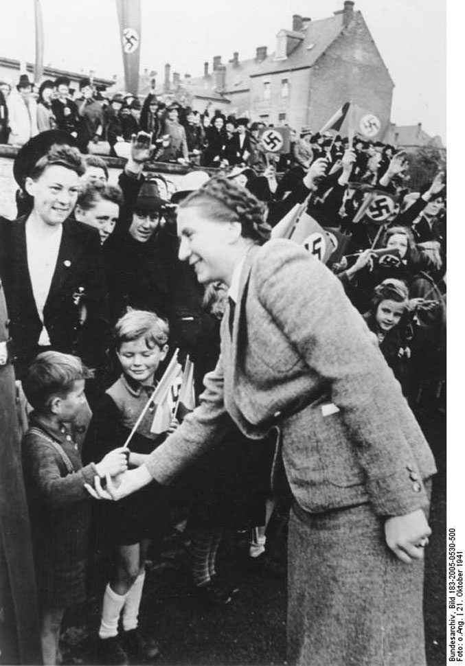 [Below: Gertrud Scholtz-Klink, October 21, 1941, welcomed by the people of Luxemburg upon her arrival. Gauleiter Gustav Simon had given a speech before a massive crowd of women in the exhibition hall of the city of Luxembourg. The women of Luxembourg showed such massive interest that the huge hall was closed prematurely due to overcrowding. Nonetheless many women listened intently outside of the hall. Courtesy of the Bundesarchiv.]