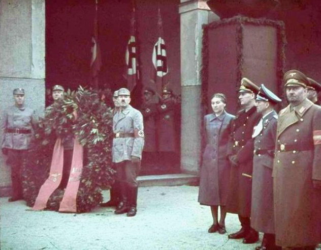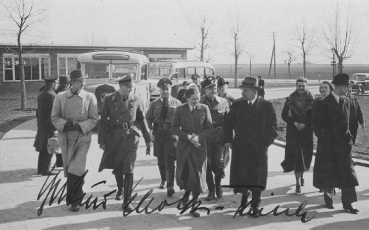 [Below: From the front, left to right: Wilhelm Frick, Julius Streicher; second row: Joachim von Ribbentrop, Gertrud Scholtz-Klink; unknown two men; in the back: Adolf Hühnlein, the Korpsführer of the National Socialist Motor Corps (NSKK), a position he would have until his death in 1942.]