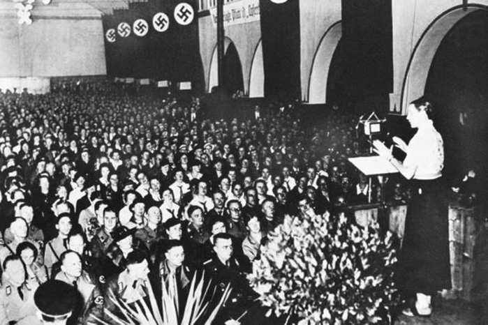 [Below: Gertrud Scholtz-Klink at a Party Rally in 1938, talking to the Women's League.]