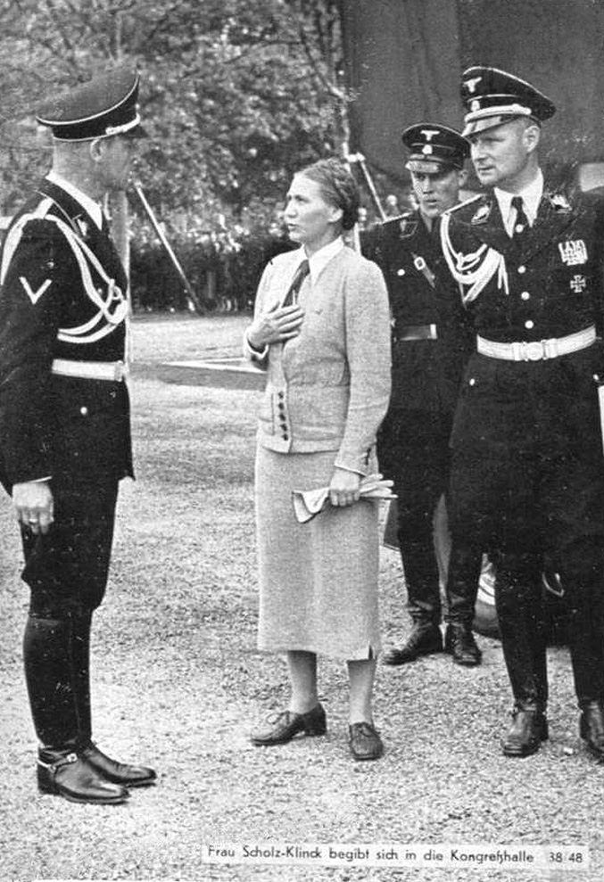 [Below: Gertrud Scholtz-Klink with SS officers at the 1938 Nuremberg NSDAP rally.]