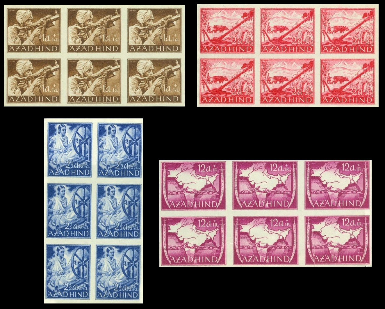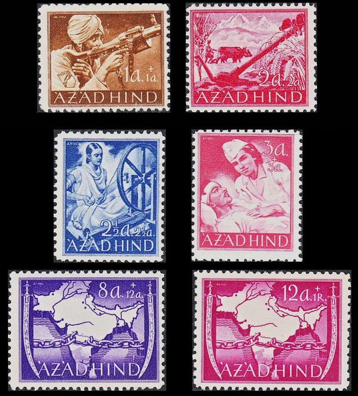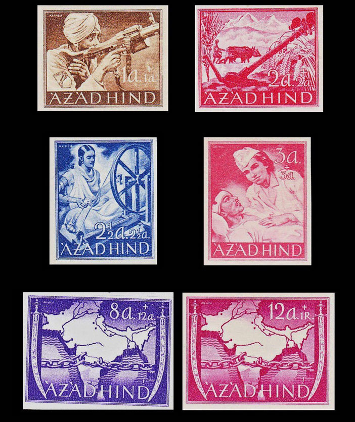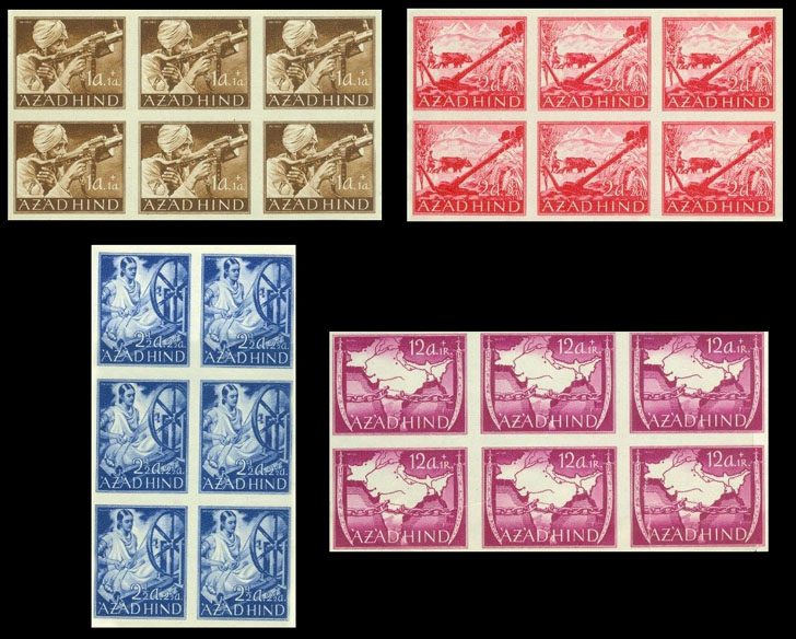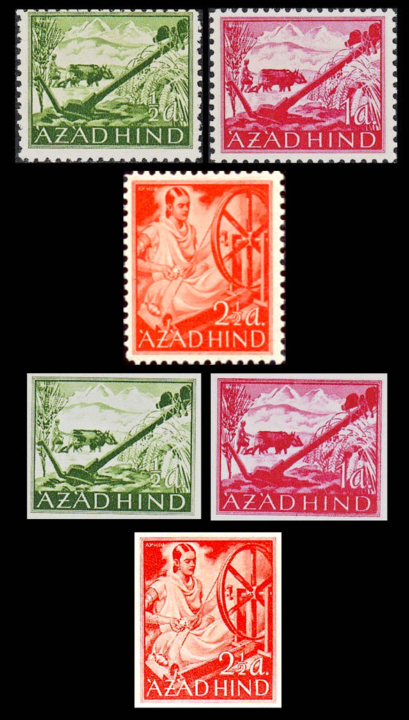 [Below: These stamps were prepared for use in the Andaman and Nicobar Islands (a group of islands situated in the Bay of Bengal), which were under Azad Hind administration since December 29, 1943, but were never used. Note that these stamps, unlike those above, have no surcharge.]