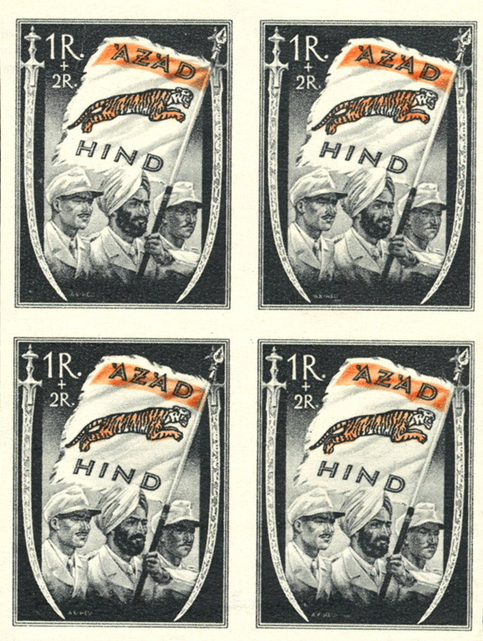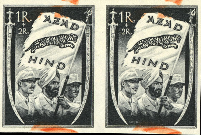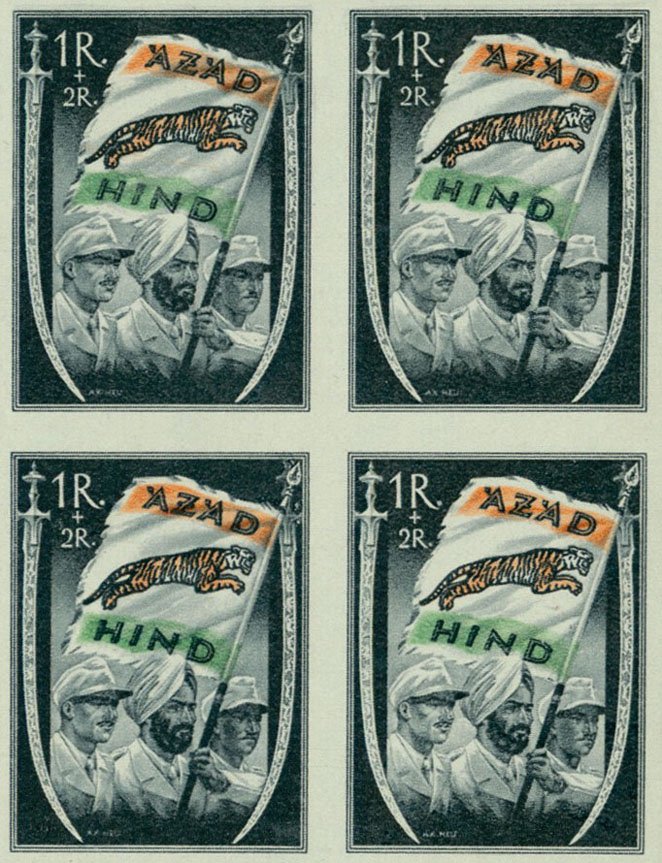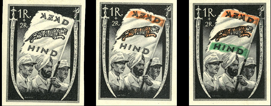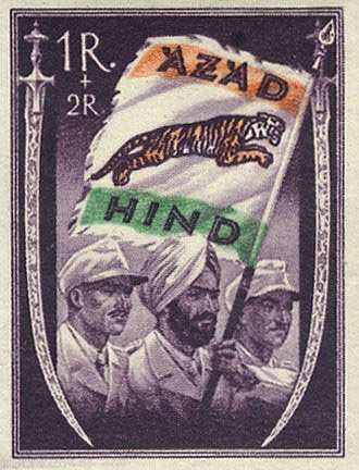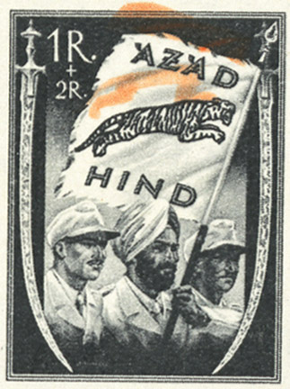 [Below: This design is the highest value of the Azad Hind stamps shown above. It is also the rarest and by far the most expensive. The two stamps on the left are examples of rare color variations, with the one of the right being the complete example.]