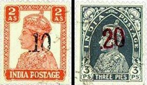 [Below: The Andaman and Nicobar Islands had been liberated from British occupation in 1942 by Japanese forces. They continued to use British stamps even under the Azad Hind Government. These two stamps contained overprints as a surcharge and were used solely on these islands.]