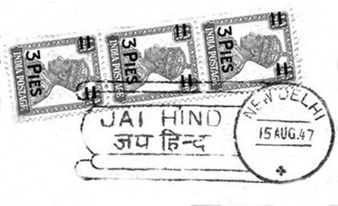 [Below: Here is a commemorative 'Jai Hind' postmark using an overprinted strip of British stamps. 'Jai Hind' was a popular Indian National Army battle cry and a patriotic slogan.]