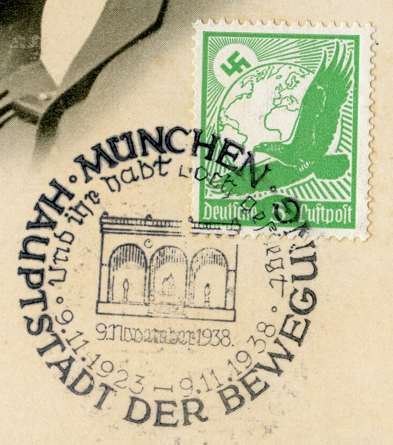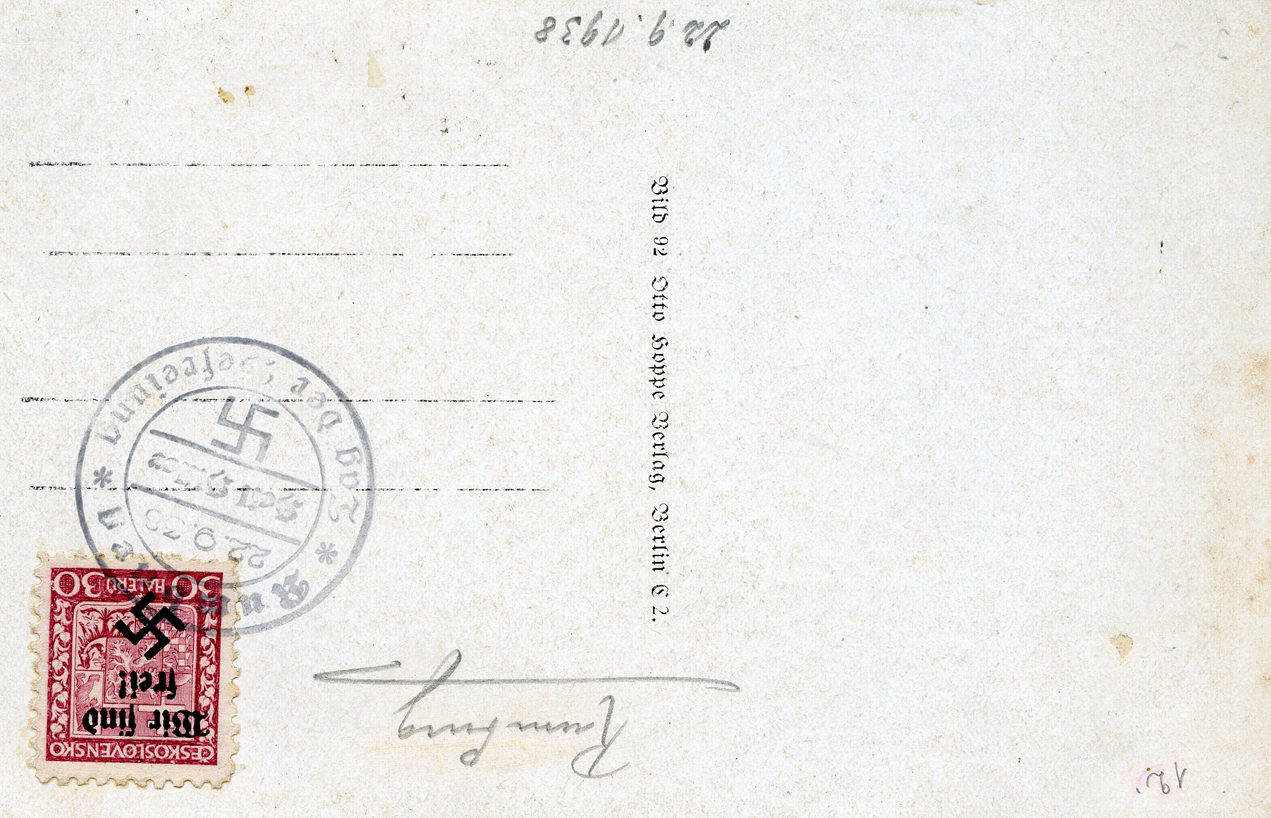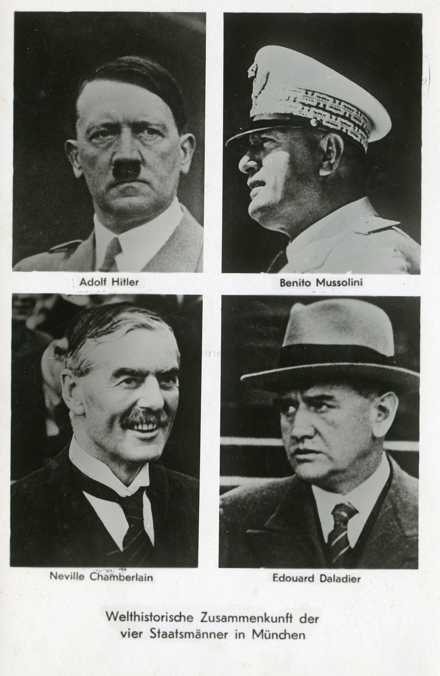 [Below: This is a pretty strange double postcard commemorating the September 1938 'Munich Agreement', a peace agreement between Germany, Great Britain, France, and Italy, which allowed Germany to annex the Sudetenland. The left side of the postcard shows the British Prime Minister Neville Chamberlain and the French Prime Minister Édouard Daladier. I don't think I need to tell you who the other two people are! Click to enlarge.]