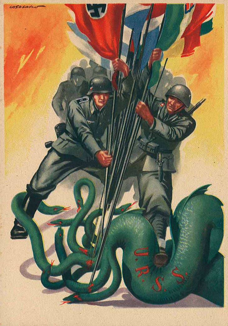 [Above: Postcard. 'U.R.S.S.' stands for 'Unione delle Repubbliche Socialiste Sovietiche', or 'Union of Soviet Socialist Republics'. It is titled 'Together we end the Soviet-Bolshevik hydra!' Circa 1942.]