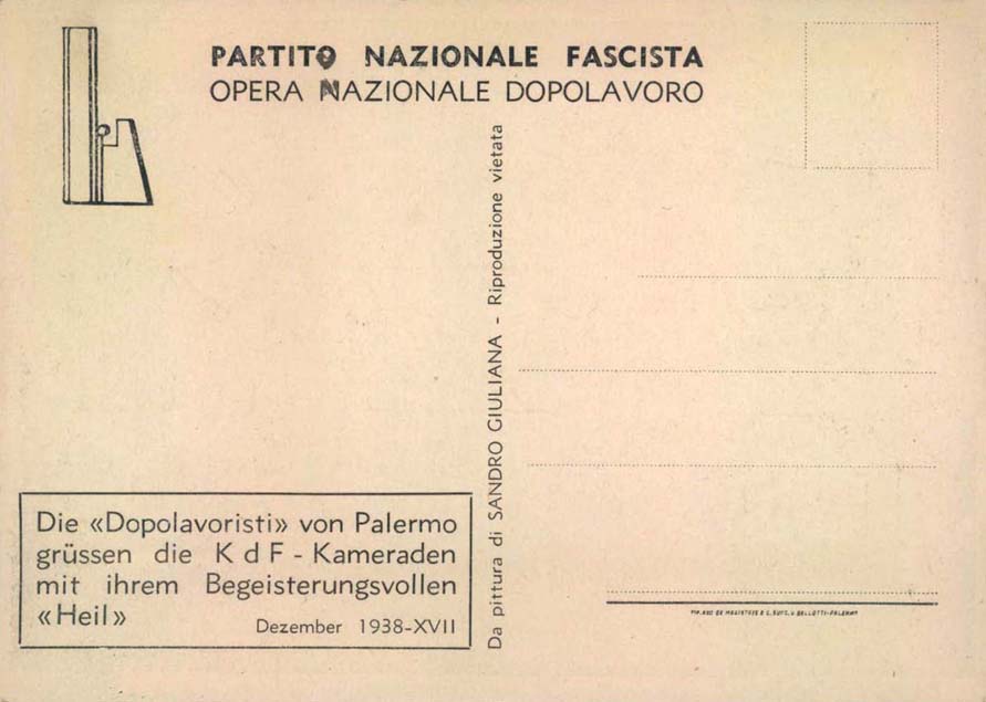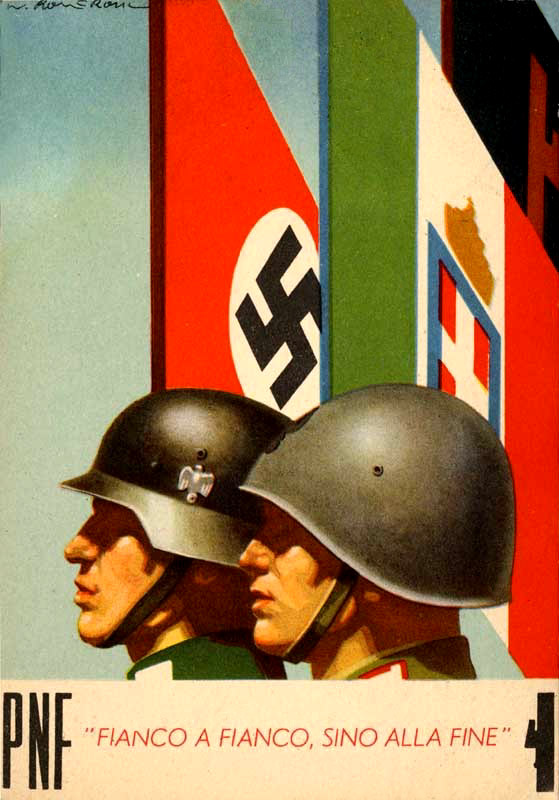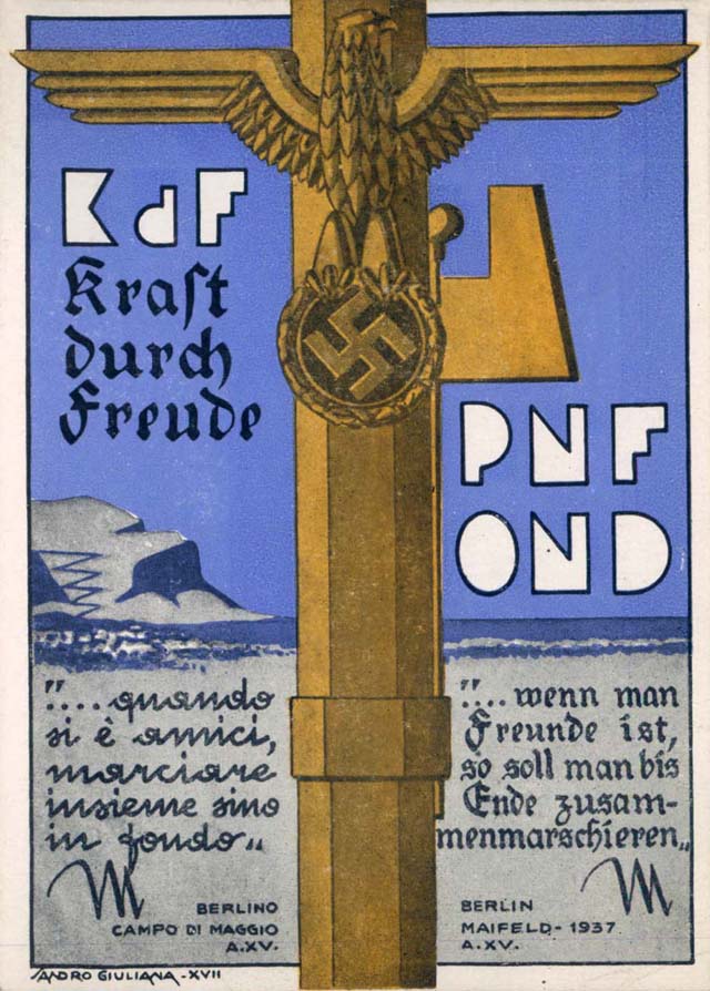 [Above: Italian postcard celebrating German and Italian social programs. KdF stands for the German 'Strength through Joy' program. 'PNF' stands for 'The National Fascist Party', while 'OND' stands for 'National Opera After Work'. The two countries cooperated with one another in more ways than a military alliance as this postcard shows. The quote is from Mussolini and basically says friends should stick together until the very end. He really meant it. He stuck by his beliefs and his comrades until death.]