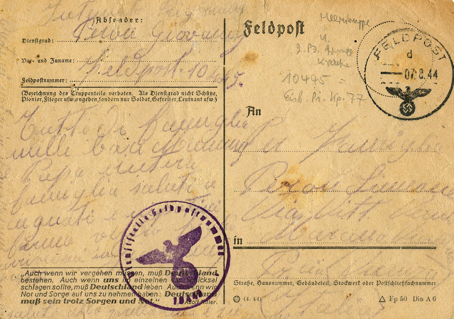 [Above: Front. Here is a Feldpost card from an Italian volunteer in the German Wehrmacht, August 7, 1944. Click to enlarge.]