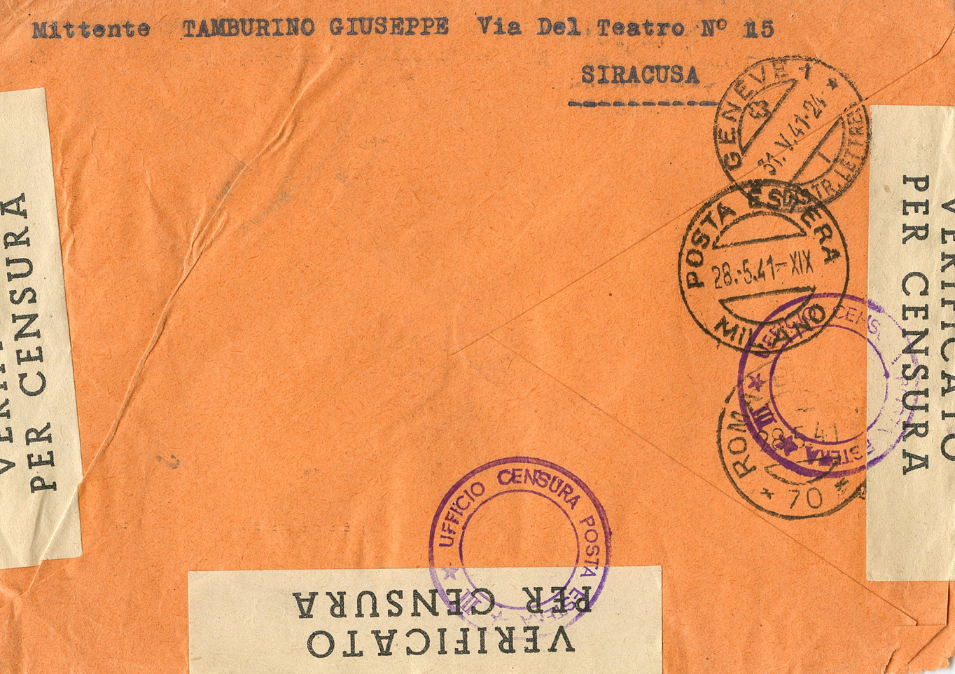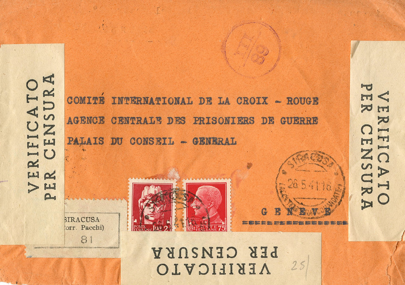 [Above: Registered envelope from May of 1941 sent to Geneva, Switzerland to the Red Cross Prisoner of War Agency. You'll note it has Italian censor tape on three sides of the envelope.]