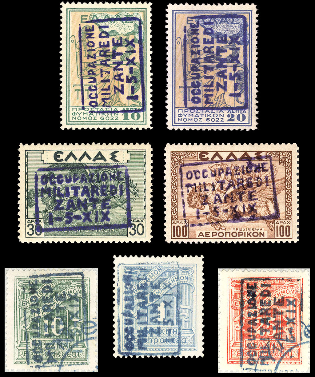 [Above: Italian Ionian Islands (Zante) from 1941 showing overprinted variety with regular Italian stamps.]