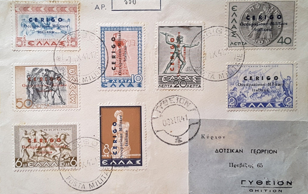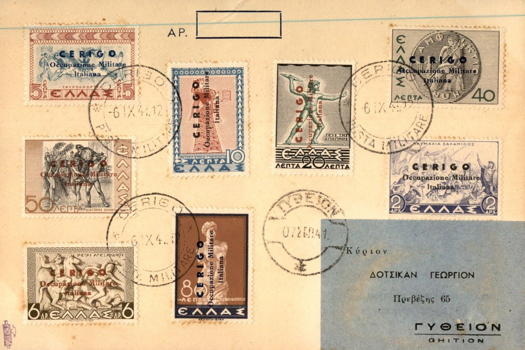 [Above: An Italian occupation envelope from the island of Cerigo (Greece). This is a private overprint and fairly rare.]
