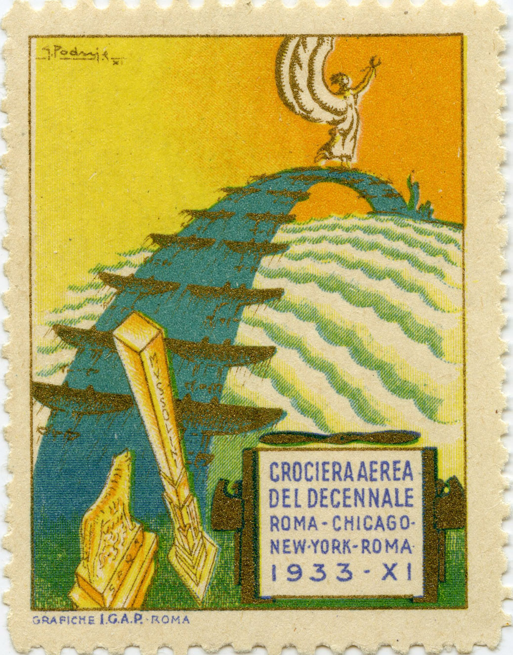 [Above: This advertising stamp (check out the pole that says Mussolini on it) says: