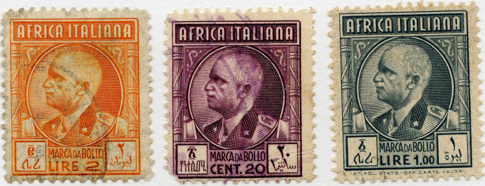 [Above: Another set of fascist era tax stamps bearing the image of the Italian King Victor Emmanuele III. These were used in Africa and have Amharic (Ethiopia) and Arabic languages on them.]