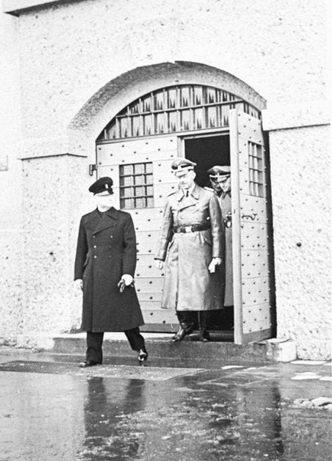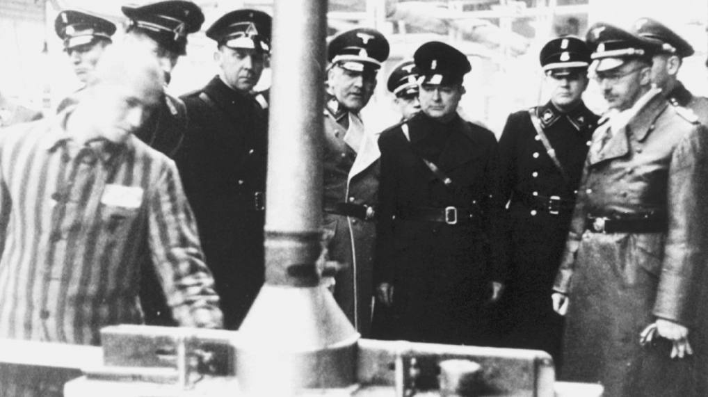 [Below: Anton Mussert with Himmler at a work camp showing a prisoner working on a machine.]