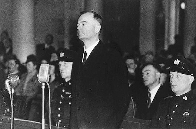 [Below: Guilty of self-sacrifice and loving his country. This picture of the kangaroo court took place on November 28, 1945.]