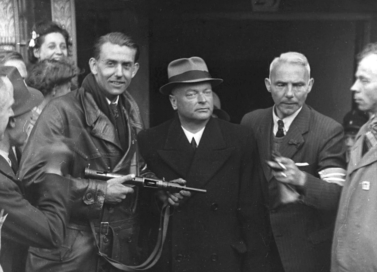 [Below: Anton Mussert arrested at Korte Vijverberg (street) in The Hague, 1945. Check out the sneering coward on the left. He thinks he is real tough with his little gun. Click to enlarge.]