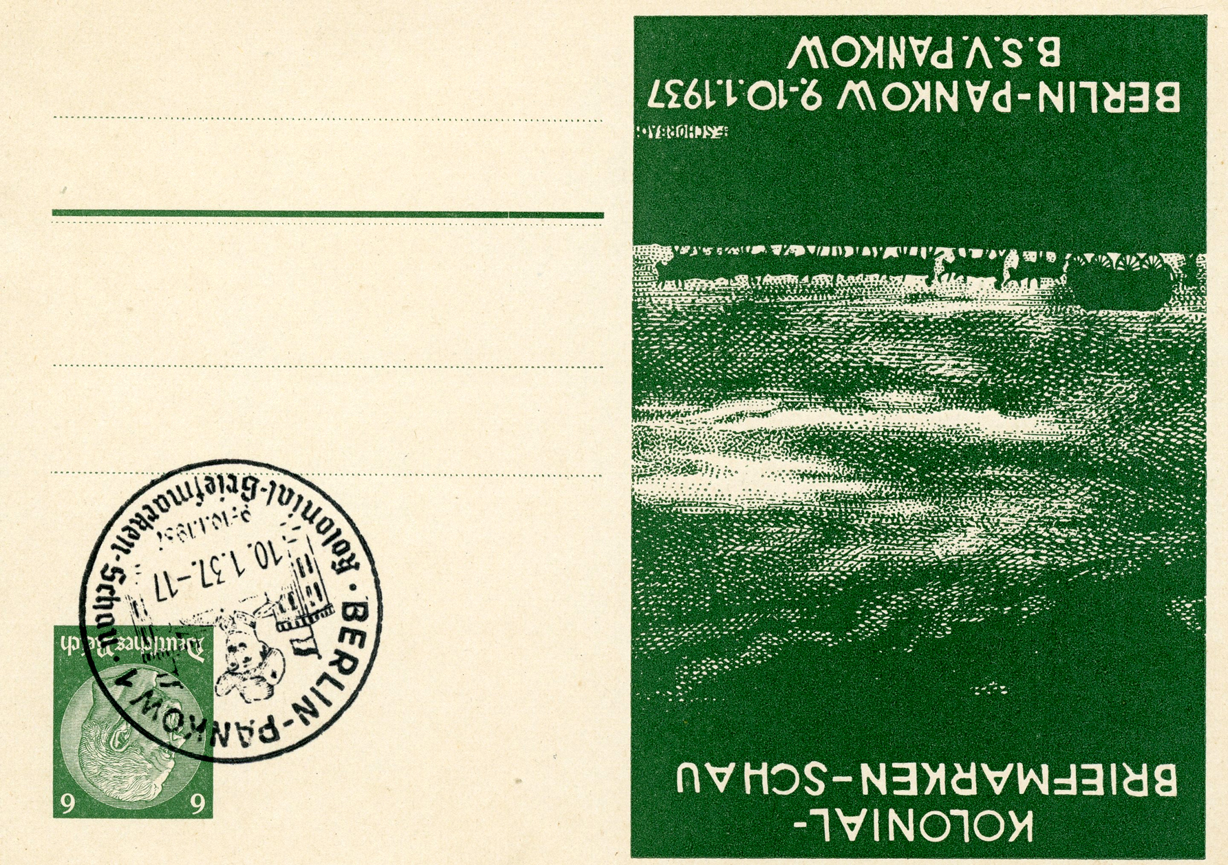[Above: This special envelope, from January 1937, shows Germany's 'lost colonies' (stolen) and advertises a 'colonial stamp show'. It also has a special cancel from Berlin-Pankow (Pankow is the most populous and the second-largest borough by area of Berlin).]