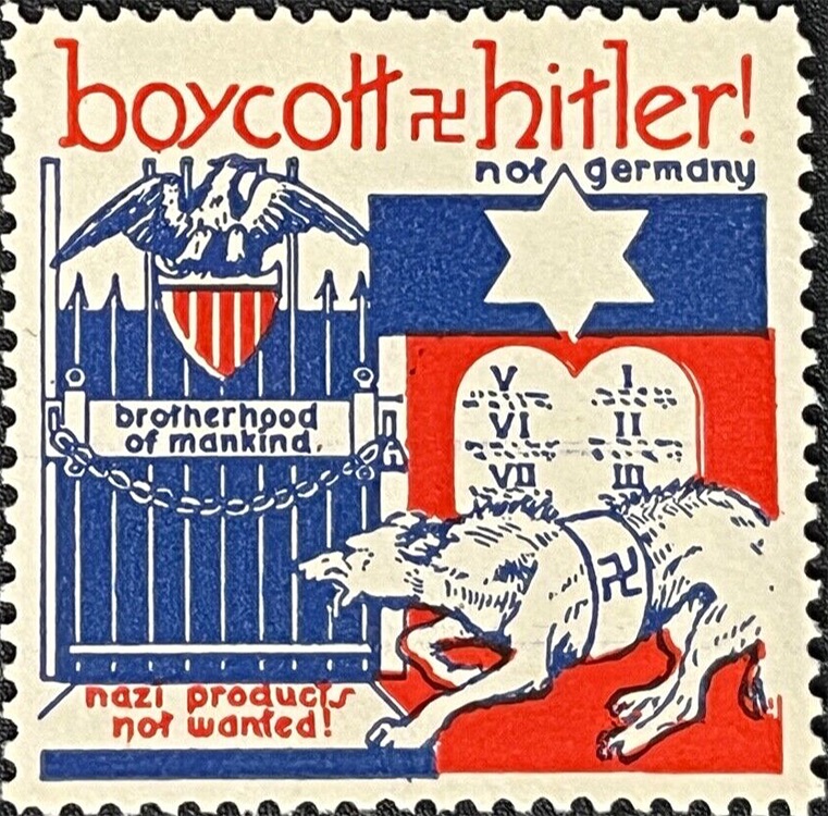 [Below: Propaganda stamp: 'Boycott Hitler not Germany - Nazi products not wanted'.]