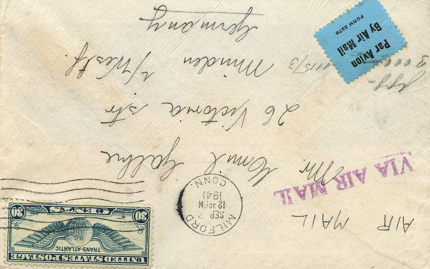 [Below: American envelope canceled on September 2, 1941 and sent to Germany. Front.]