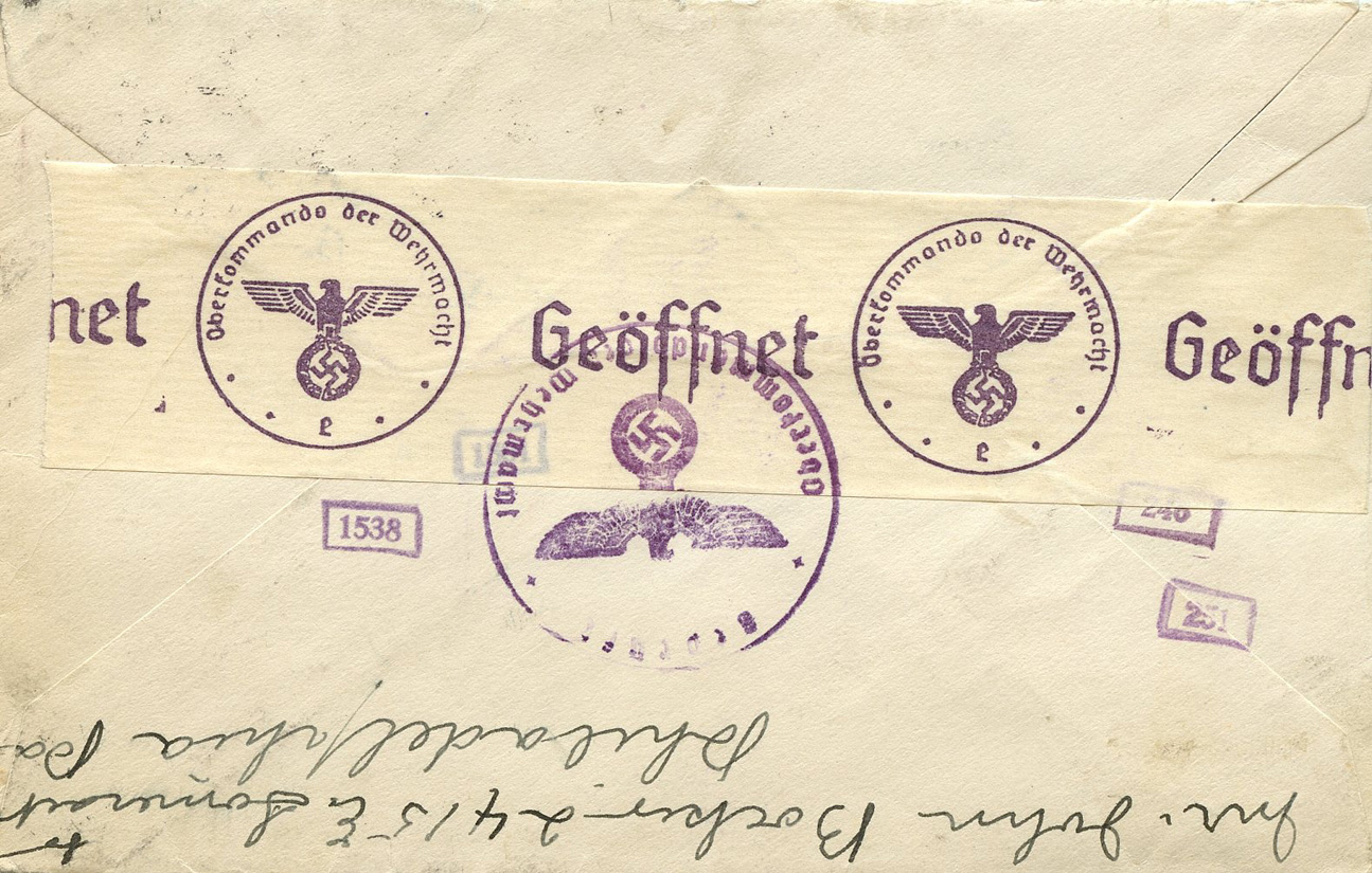 January 15, 1940, to Lörrach, Germany. I like the 'Germany!' with an exclamation mark... note the eagle and swastika censor stamp. It says 'Geprüft' (examined) and 'Oberkommando der Wehrmacht' (High Command of the Armed Forces).]
