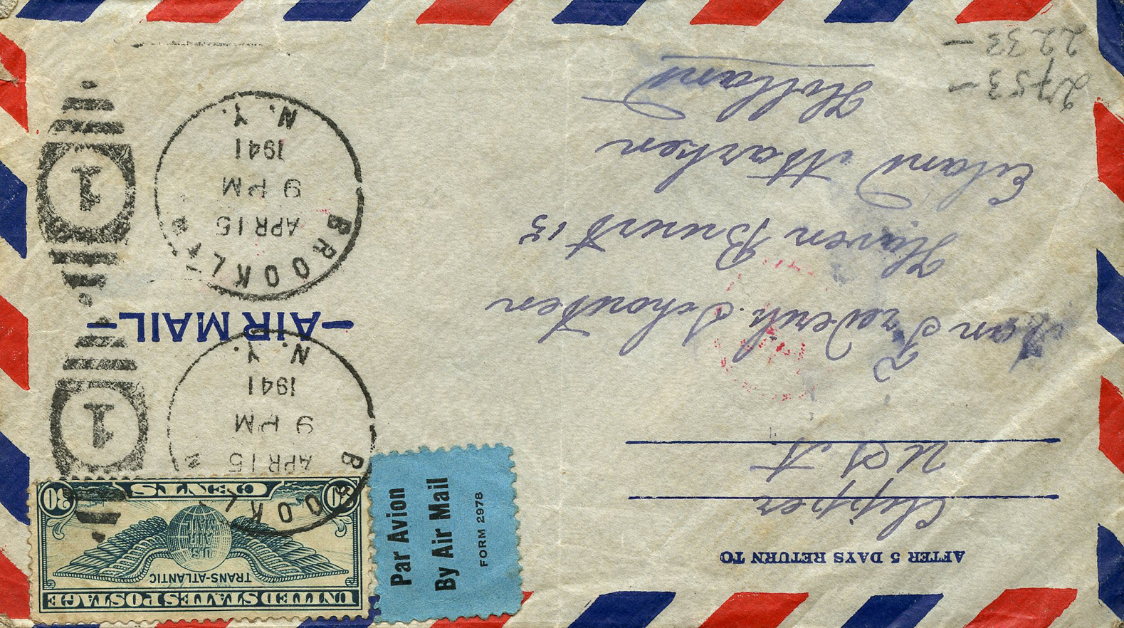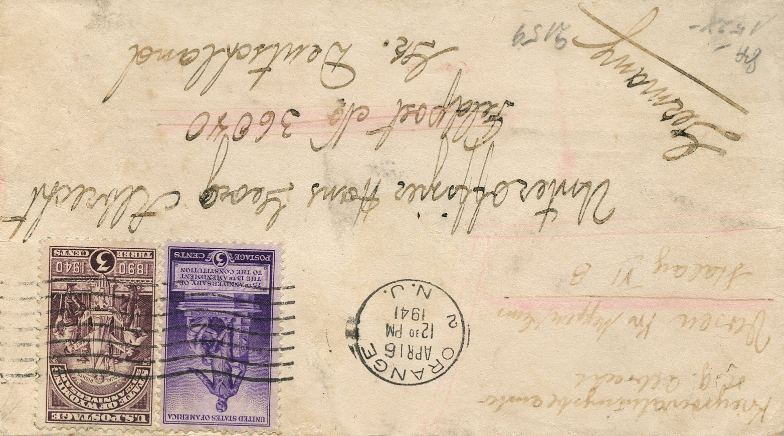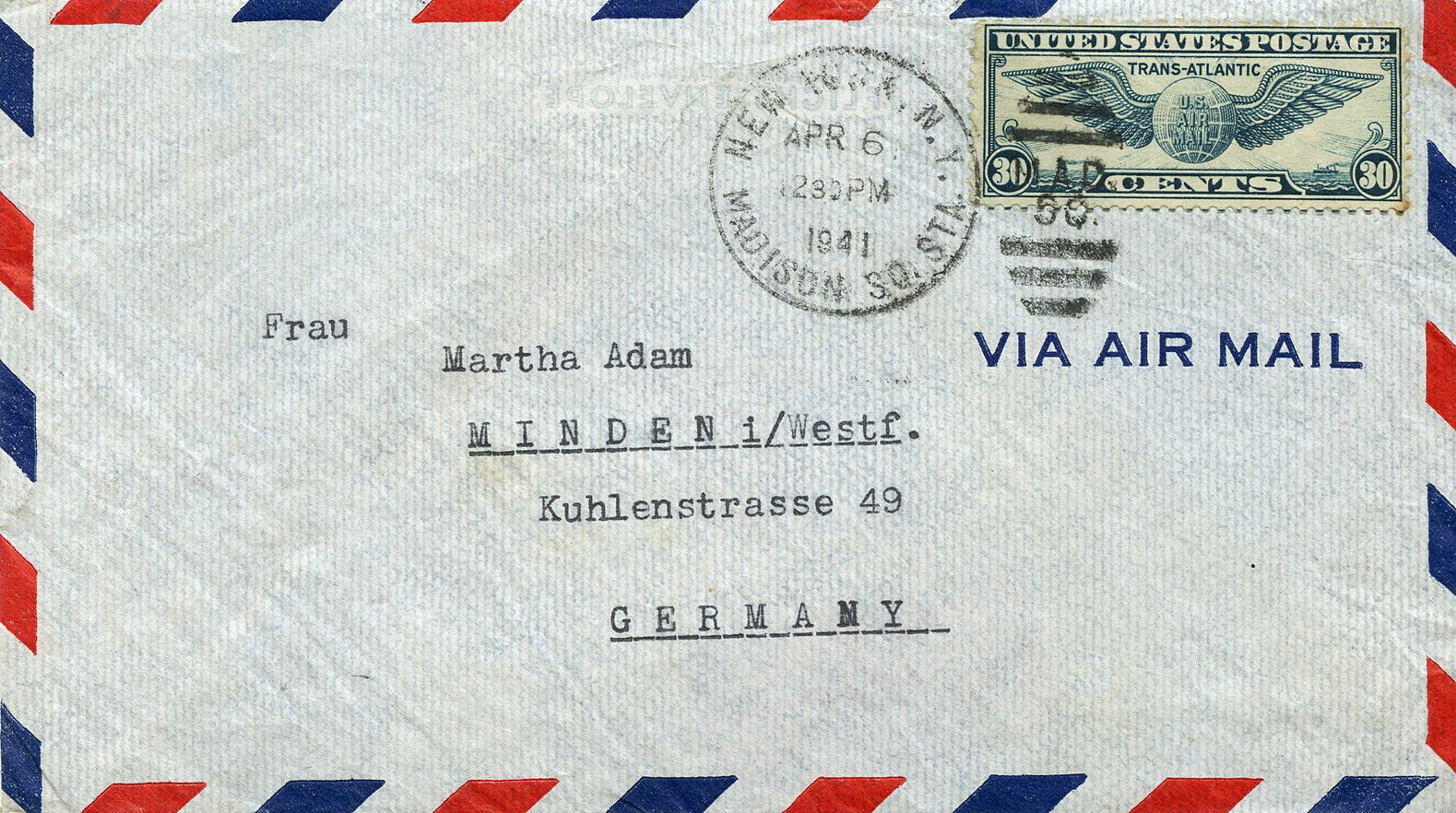 [Below: American envelope canceled on April 6, 1941 and sent to Germany. Front.]