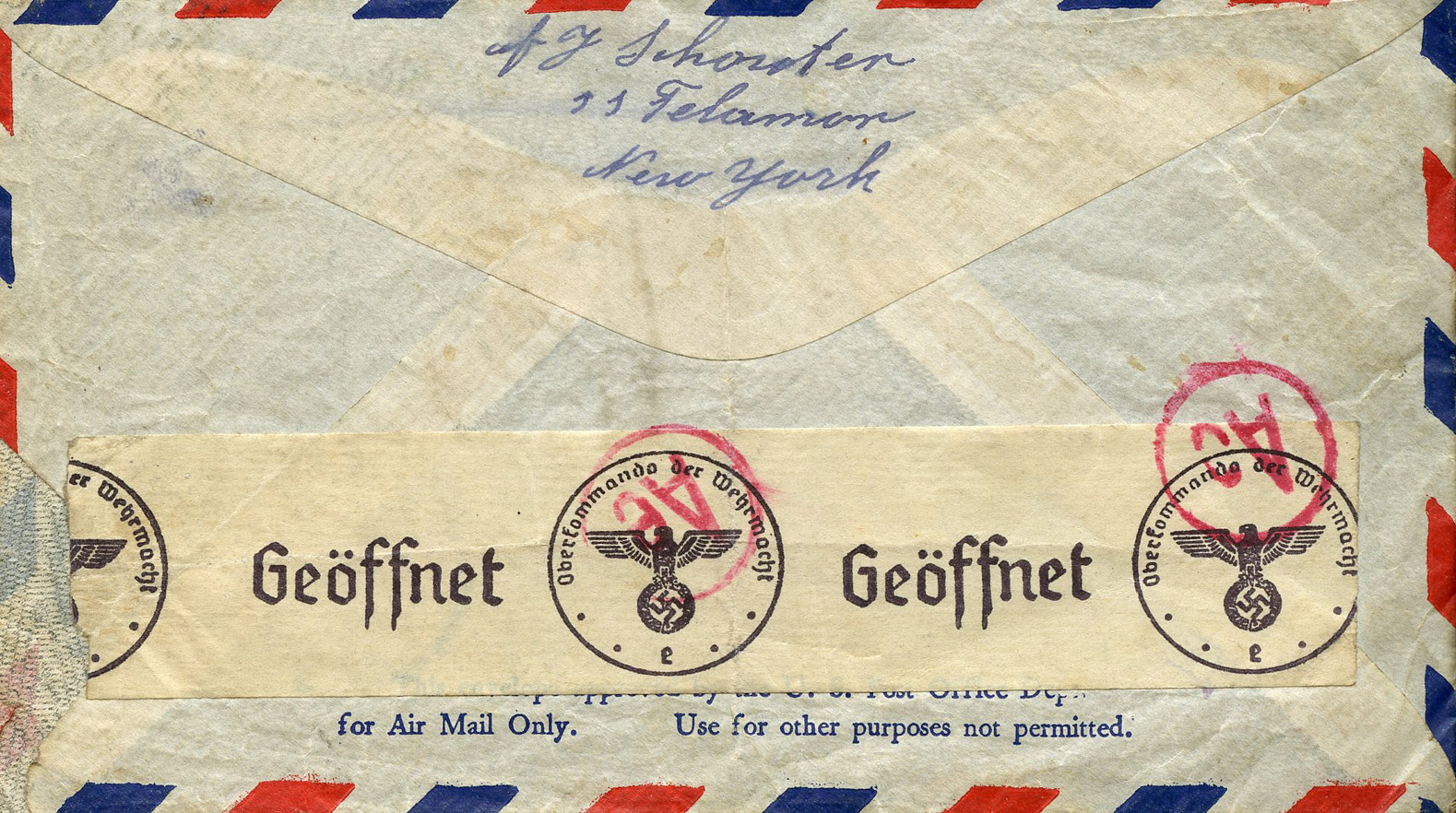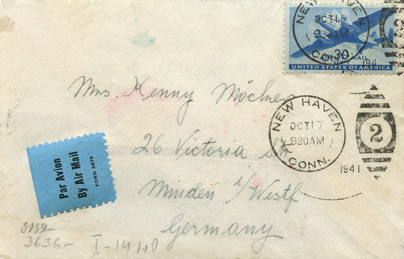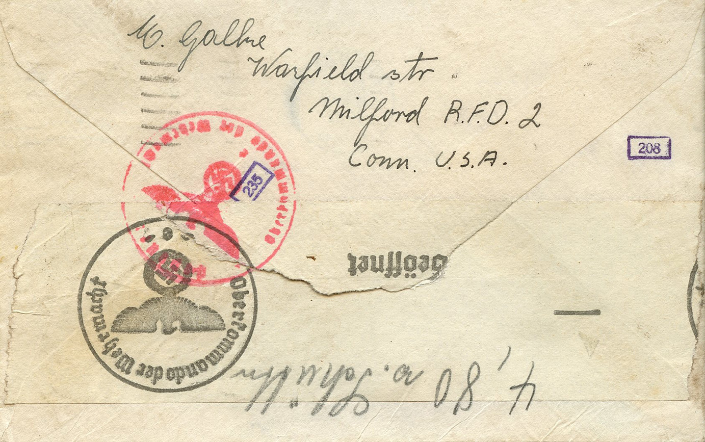 [Below: American envelope canceled on October 17, 1941 and sent to Germany. Front.]