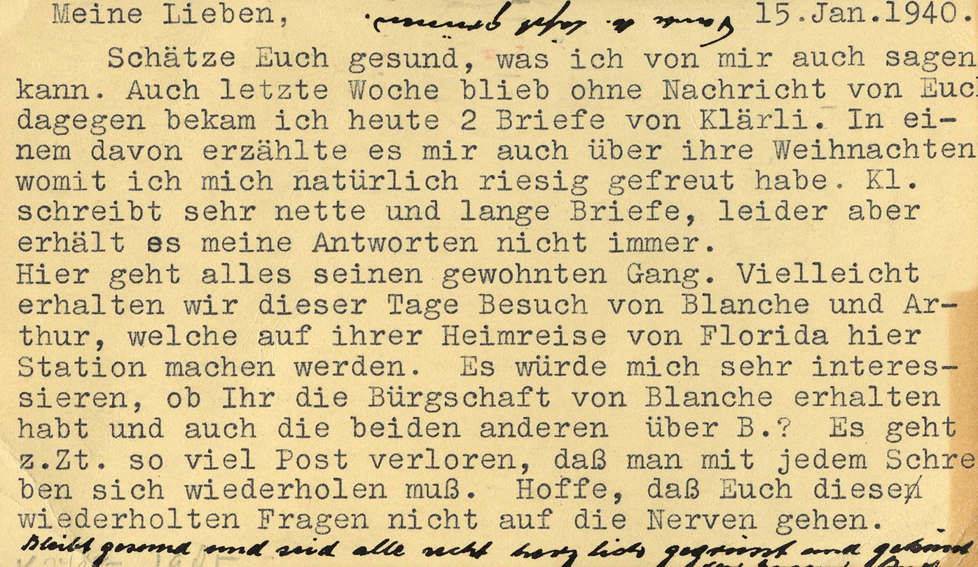 Schätze Euch gesund, was ich von mir auch sagen kann. Auch letzte ich Woche blieb ohne Nachricht von Euch dagegen bekem ich heute 2 Briefe von Klärli. In einem davon erzählte es mir auch über ihre Weihnachten womit ich mich natürlich riesig gefreut habe. Kl. schreibt sehr nette und lange Briefe, leider aber Hier geht alles seinen gewohnten Gang. Vielleicht erhalten wir dieser Tage Besuch von Blanche und Arthur, welche auf ihrer Heimreise von Florida hier Station machen werden. Es würde mich sehr interessieren, ob Ihr die Bürgschaft von Blanche erhalten habt und auch die beidden anderen über B.? Es geht z.Zt. so viel Post verloren, daß man mit jedem Schreben sich wiederholen muß. Hoffe, daß Euch diese wiederholten Fragen nicht auf die Nerven gehen.'