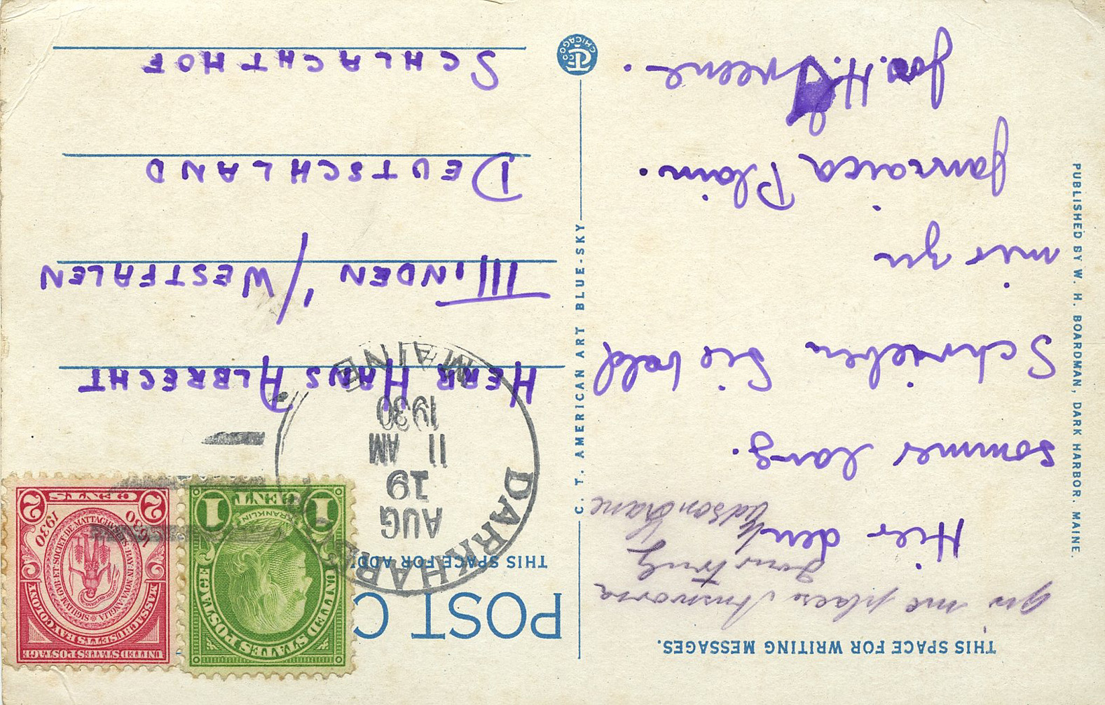 [Below: Here is another piece of mail to the soldier above, yet sent nine years before the war. This postcard, from a cool-sounding place called Dark Harbor, was canceled on August 19, 1930 and sent to Germany. Front.]